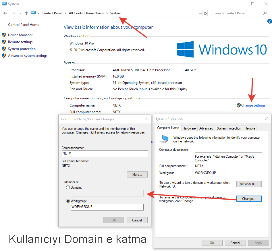Kullanıcıyı domaine katmak için kontrola panele girilir. Yada Win+R > sysdm.cpl ile direk açılır.